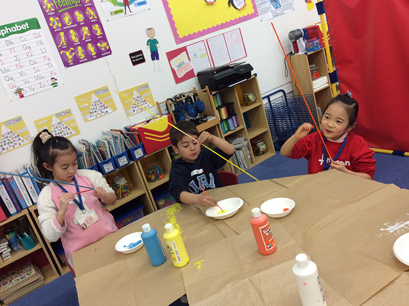 エレメンタリークラスの子達が、午後のゲームに使う長いスティックを、カラフルに塗ってます。