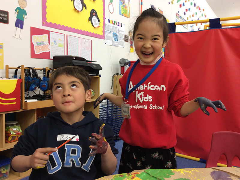 For today’s afternoon game, our elementary class is going to paint long sticks all different colors! There are a lot of sticks to paint, everyone. Work hard!